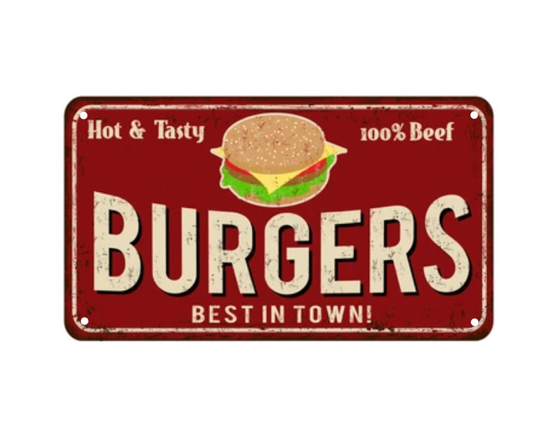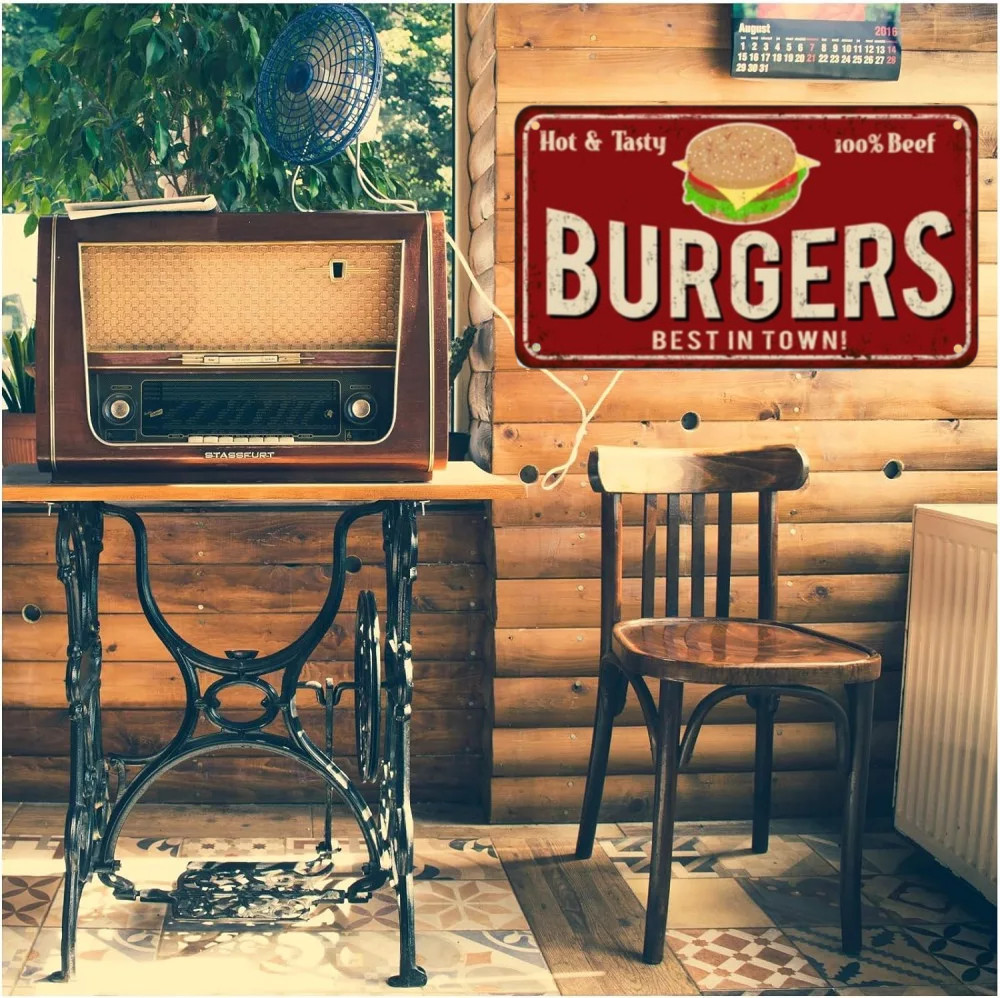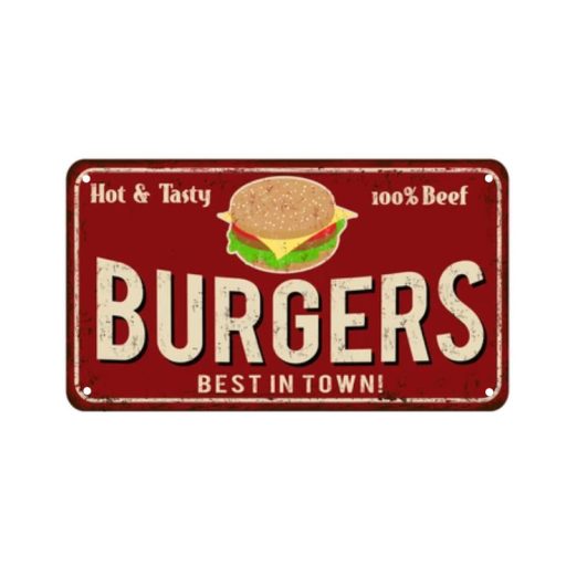 Ez a gyönyörű vintage hamburgeres dombornyomott fémtábla 'Hot & Tasty 100% Beef BURGERS Best in Town!' feliratával egy időutazást kínál a múltba és lenyűgöző módon örökíti meg a minőségi ételek világát.