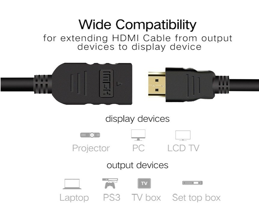 A HDMI 2.0 hosszabbító kábel használata kényelmes. Csatlakoztathatjuk a HDMI eszközöket a TV-hez vagy a kijelzőhöz, és élvezhetjük a magas felbontású videót és a kristálytiszta hangminőséget.