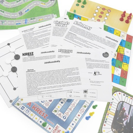 A csomag tartalma: 1 db dobókocka. 24 db játék korong, 16 db színes bábu, 3 db kétoldalú játéktábla, 6 db játékszabály.
