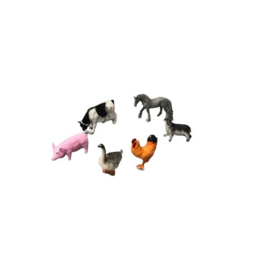 A készlet tartalma 6 db műanyag háziállat: lúd, kakas, tehén, kutya, disznó és ló.