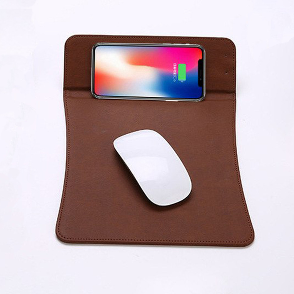 Műbőr borítású egérpad beépített vezeték nélküli mobiltöltővel és tartóval.